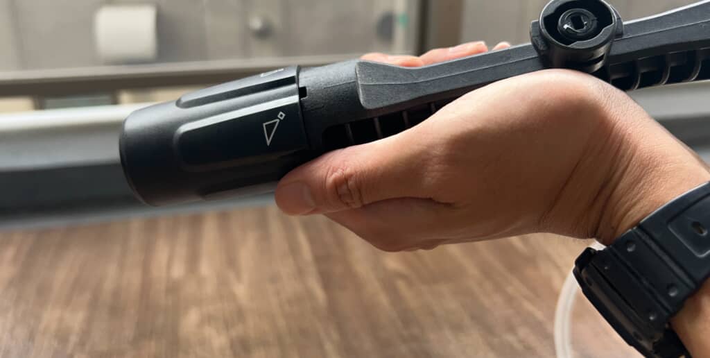 試しに5in1ノズルを切り替えてみました。「標準/強力直噴/傾斜/高角/低圧」の5モードに加え、洗浄液タンク装着時は泡洗浄も可能。対象に合わせてモードを切り替えられますが、少し力が必要な印象です。