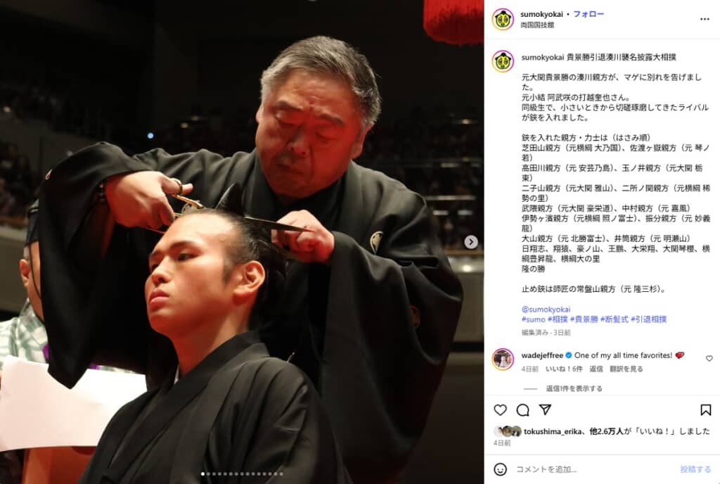 断髪式に臨んだ元貴景勝の湊川親方(画像は「日本相撲協会」公式Instagramから)