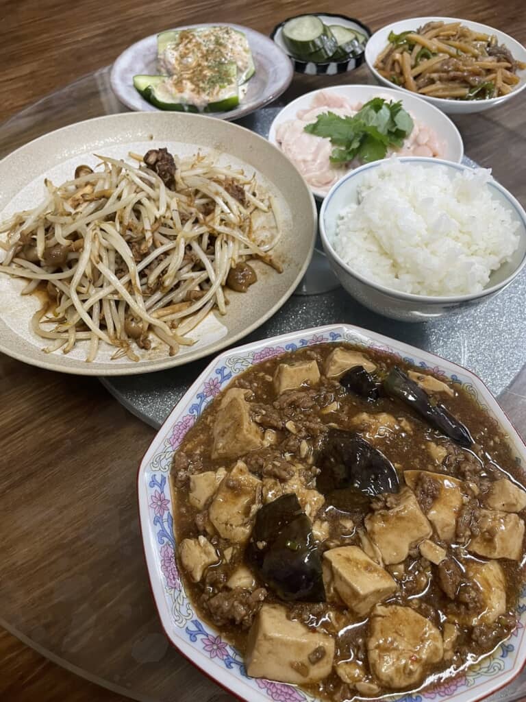 しかし、これだけではありません。奥にはニラもやし肉炒め、みそ汁、そして山盛りのシューマイが並びます。どの皿も食欲をそそるボリューム感。これを「帰宅して30分」で作り上げたというから驚きです。