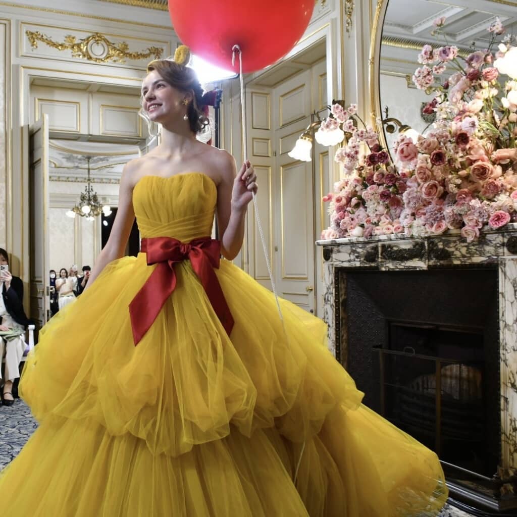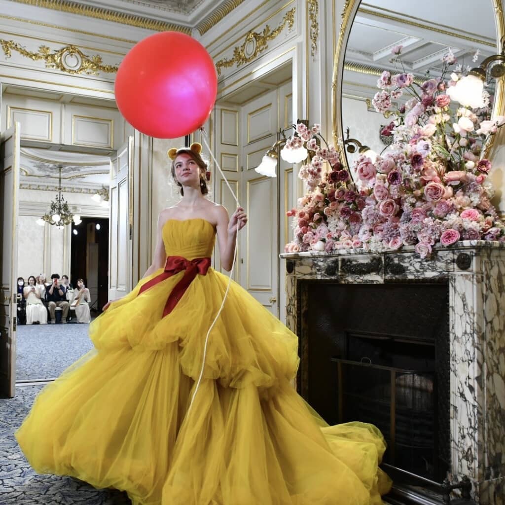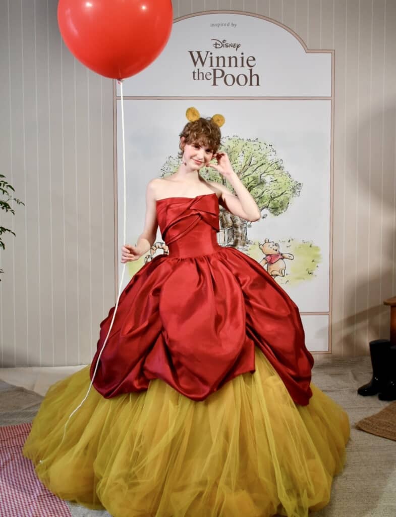 ショー会場にプーさんの音楽が流れ始めると、真っ赤な風船を手にしてドレスをまとったモデルが歩いてきました。最初に披露したのは、光沢のある真っ赤なミカド素材の身頃とスカートの黄色で“プーさんカラー”だと一目でわかるドレスです。