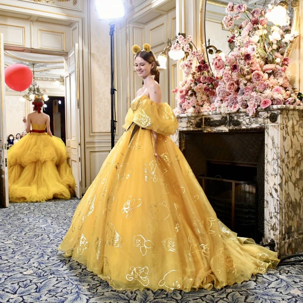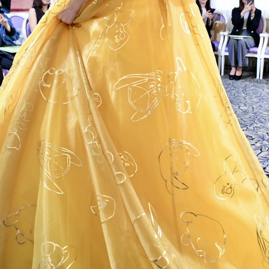 続いて登場したのは、大人でも身に着けやすい落ち着いたイエローのチュールをたっぷりと使用してプーさんのフォルムを表現したドレスです。ティアードのバルーンシルエットで大きく広がるスカートはボリューム感があり豪華な印象ですが、素材のおかげか軽やかにも見え、絶妙なバランスがすてきでした。