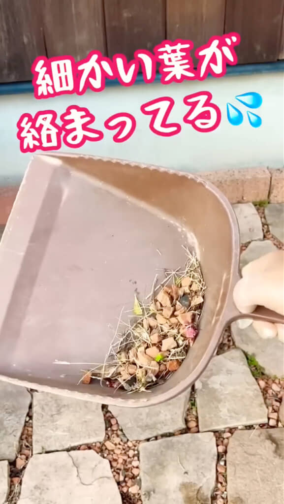 そして、いざ掃除をしようと雑草を抜き、ほうきがけをすると、砂利と枯れ葉がごちゃ混ぜになり分別が大変。ひとつひとつ手で取り除いていたら日が暮れてしまいます。