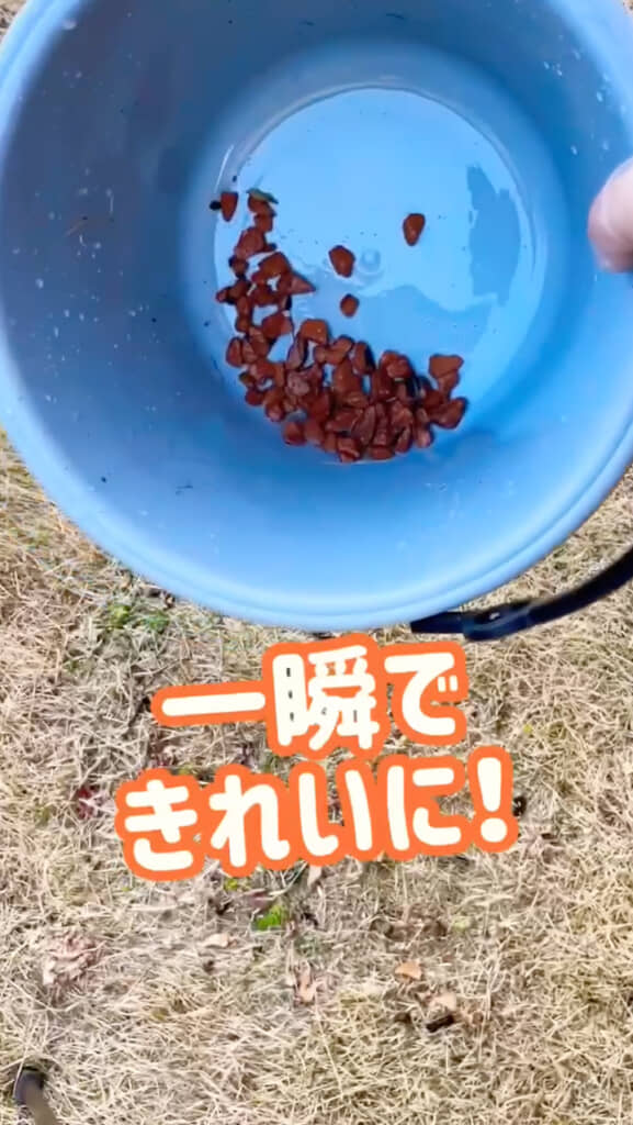 そんなときは水を入れたバケツを用意し、その中に集めた砂利と枯れ葉を入れます。すると軽い枯れ葉だけが水面に浮くので、ざばーんと水を捨てれば一瞬で分別完了! あとは、砂利を敷き直せばいいだけです。