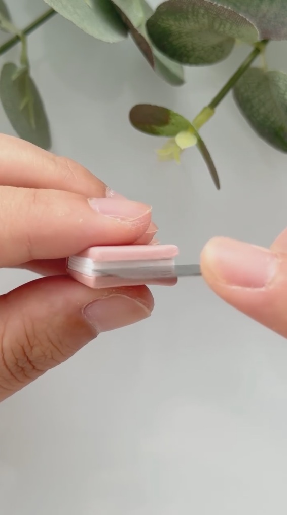 まずは、淡いピンク色の粘土を薄く伸ばし、本の背表紙の形にくり抜きます。次に、先ほどよりも少し厚めに伸ばした白い粘土を長方形にくり抜いて、ピンクの粘土で挟みました。その後、白い粘土の断面細い線をたくさん入れることで、紙の質感を演出。これで、指先サイズの小さな本が1冊完成です。
