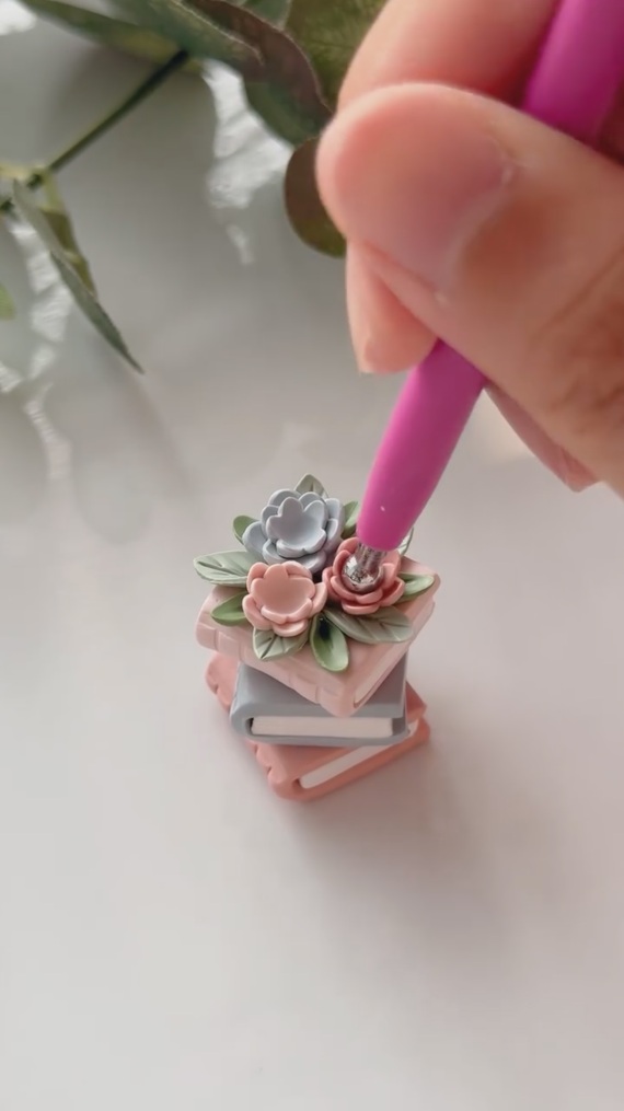 さらに、ピンクやブルーグレーの粘土を花型にくり抜きます。こちらも軽く湾曲させたら、大きさの異なるものを3つを重ねて、厚みと陰影のある小さなお花を作りました。八重咲になったお花を先ほど作った葉っぱの上にいくつか飾り、中央に金色の小さなビーズをあしらうと……本の上に色とりどりの美しい花が咲いているように見えてきます!
