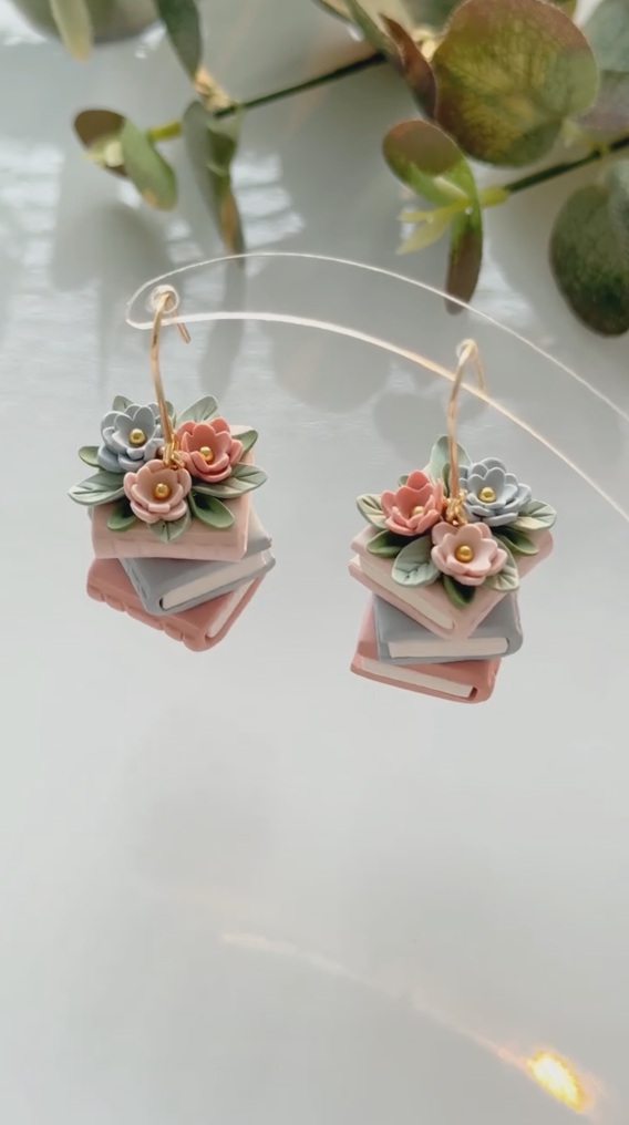 作品をオーブンで焼き、最後に金色のイヤリング用のパーツを取り付けたら、“読書の秋”にぴったりなアクセサリーが完成! ゆらゆら揺れる本とキュートなお花が目を引く、美しい作品が出来上がりました。