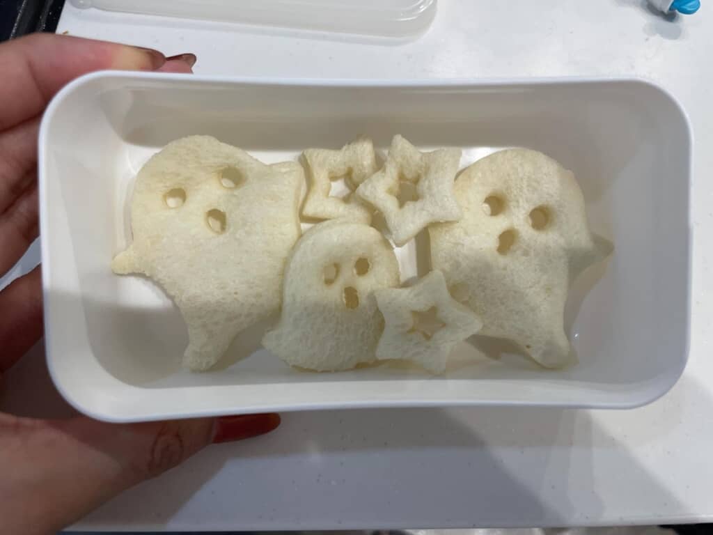 さらに、娘ちゃんが保育園で食べる主食も用意。息子くんのサンドイッチをパンの部分だけにした「おばけパン」と「お星さまパン」です。娘ちゃんはあまりにかわいかったため、食べるのがもったいなかったのか1つ家に持って帰ってきたとか。その気持ち、分かりますよ!