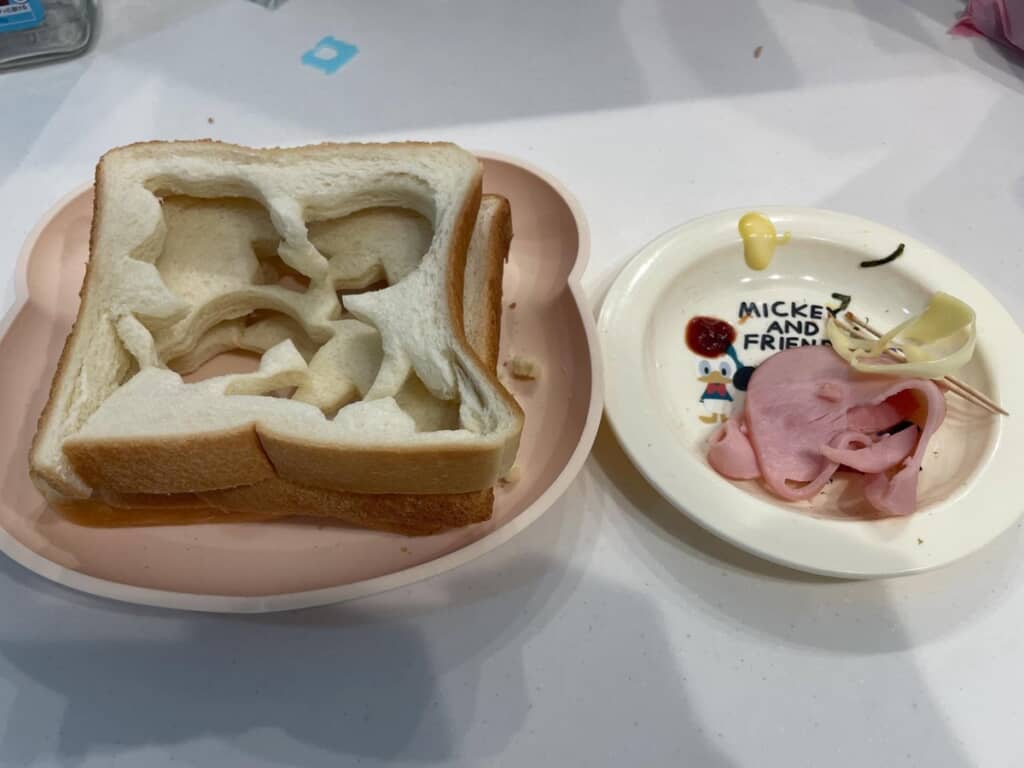 そしてママの朝ご飯は……? サンドイッチ用に型抜かれたあとの、耳がメインとなった食パンが2枚。同様に、型抜かれたあとのハムとチーズ。それがママの朝ご飯でした。子どもにかわいいお弁当を楽しんでもらうとき、誰かがその残りを食べる役目を担っているもの。バックステージを垣間見るようなこの光景に、キャラ弁を作ったことがある人なら大きくうなずいてしまうのではないでしょうか。