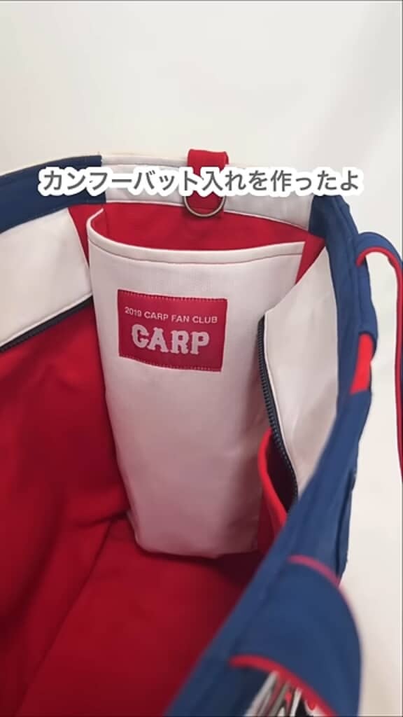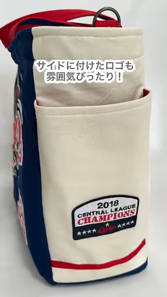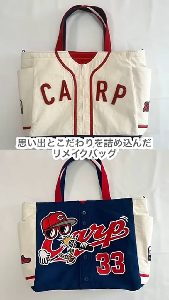 ユニフォームから出来上がったのは大容量のトートバッグでした! 前身頃をバッグ本体に使用したため、インパクトのあるデザインになっていますね。カープファンには垂涎のバッグではないでしょうか。これはかわいい……!