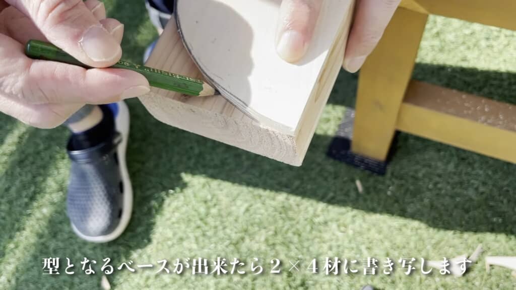 型を当てて線を引き、木材を切り出します
