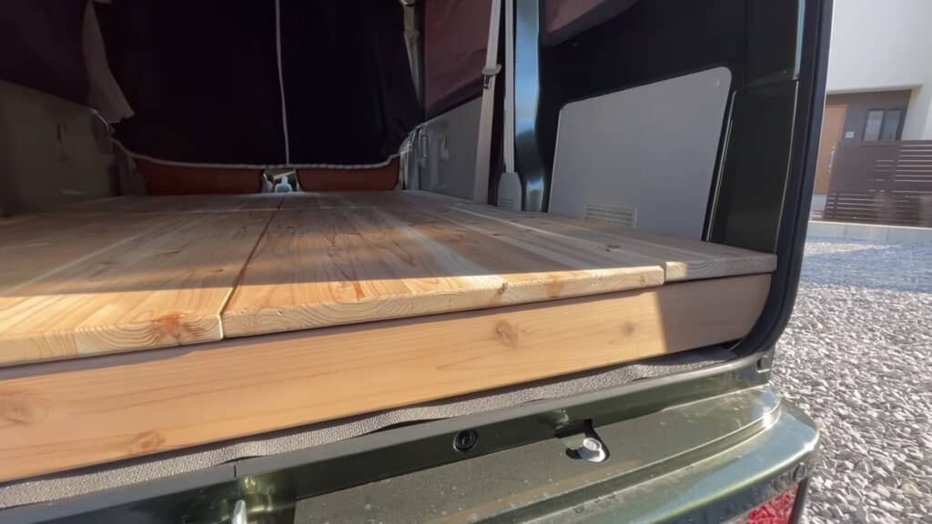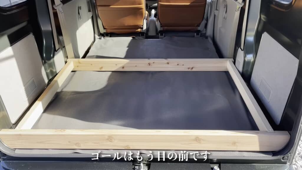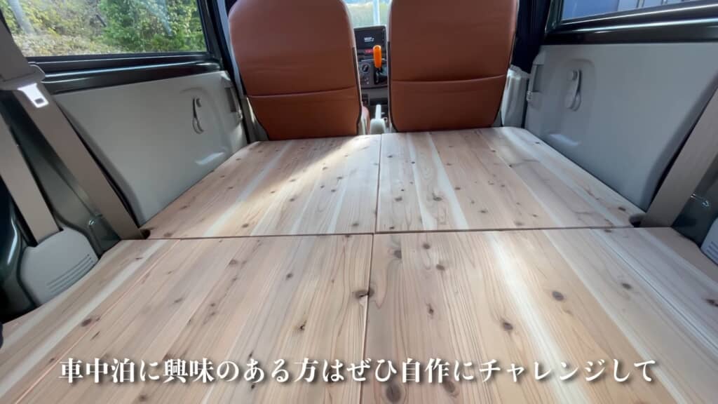 必要な素材の用意ができたら、いよいよ車内に設置する作業へ。土台となるフレームを置いて、その上に床板を敷き詰めていくと、あっという間にフルフラットの床が完成しました。無垢な木材ならではのあたたかみのある雰囲気がとても良い感じ。車中泊で過ごす時間を有意義に感じさせてくれそうですね。