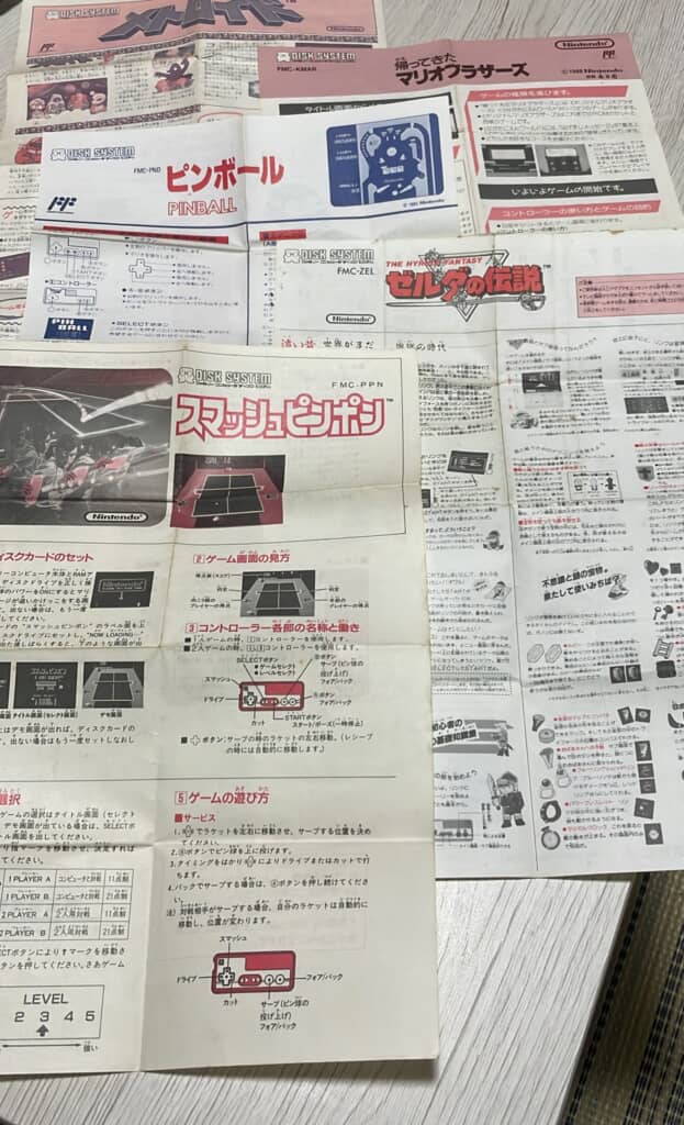 ファミコン用ディスクシステムソフトの説明書が複数並べられている。