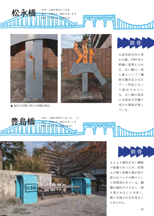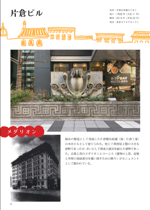 ご本では現地の写真、住所、竣工年、解体年といった情報、またそれが「カケラ」になっていった経緯とともに38カ所が紹介されています。おおよそ1ページに1カ所が掲載され、カケラについての由来がまとめられていますが、竣工や解体年をきっちり押さえ、時には当時の建物の全体がわかる写真も交えながらもさらりとコンパクトに見せる的確さは、作者さんが近代建築に関わって積み重ねてこられた土壌のしっかりした厚みを感じます。