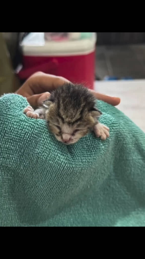 見つけたときには、まわりに兄弟の姿はなく、ひとりぼっちの状態。さらにへその緒も付いたままで、目も開いておらず、生きるか死ぬかの瀬戸際でした。