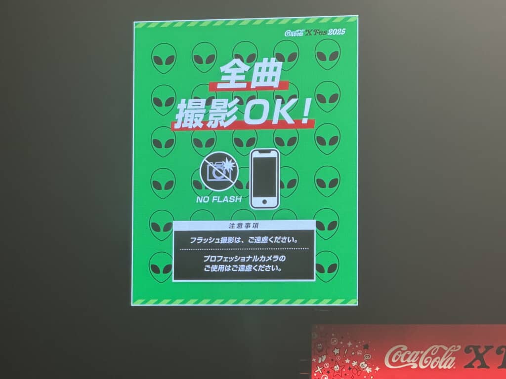 XGの登場をファンの「ALPHAZ」が待ち侘びる中、会場に映し出されたのは「全曲撮影OK」の文字。
