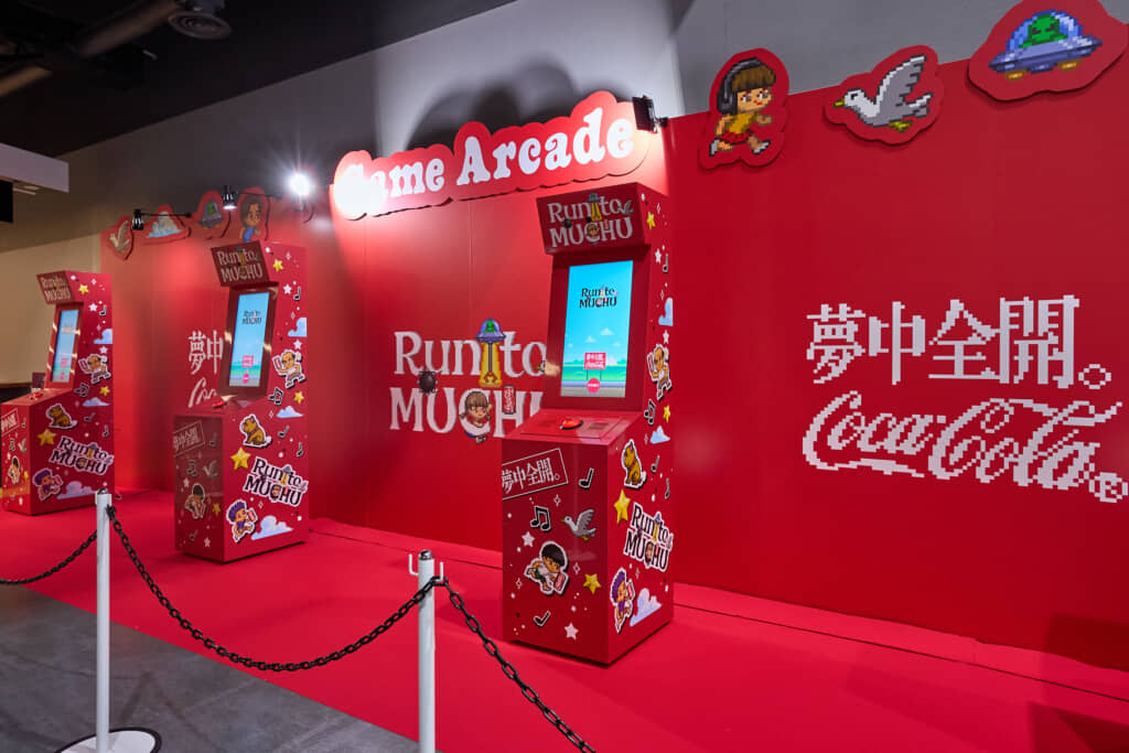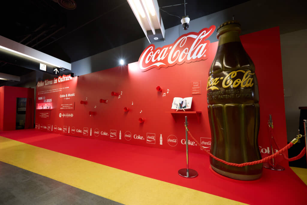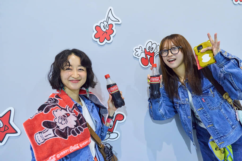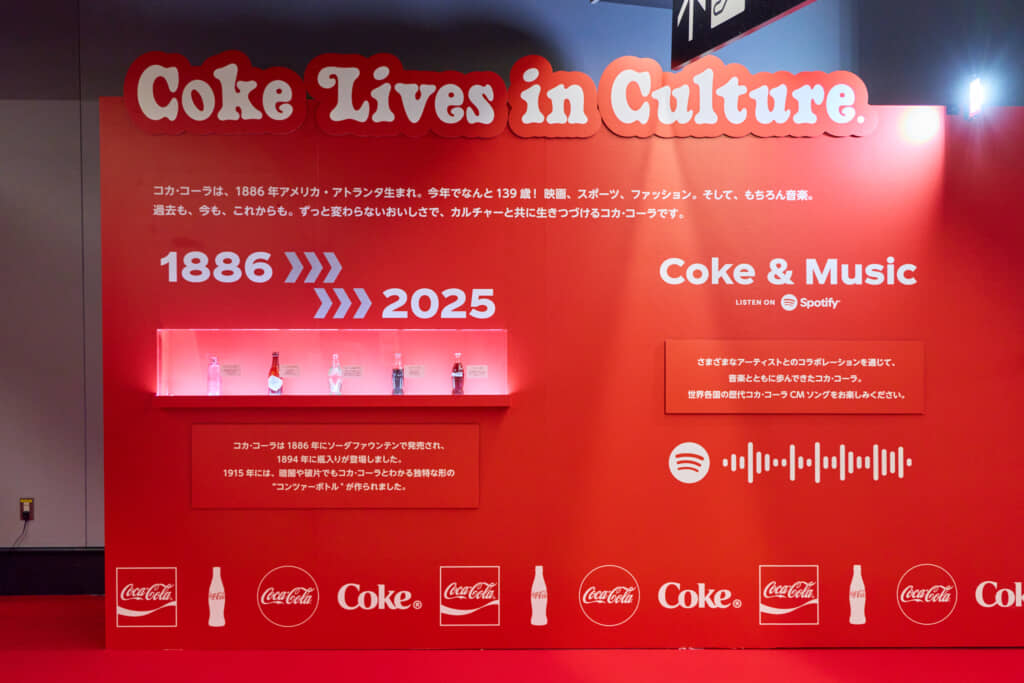 また、先に進むと歴代の「コカ・コーラ」ボトルがずらりと展示されていたほか、壁に耳を近づけると、歴代CMソングが順に聞けるコンテンツ、会場限定デザインの写真が撮れるフォトブース、来場者自身のアバターをその場で作ってゲーム内に登場させられるゲームコーナー、レコード型の巨大リサイクルボックス、サッカーファン必見のadidasブース、各アーティストのライブプレイリストを公開していたSpotifyブースなどのコンテンツも大人気。
