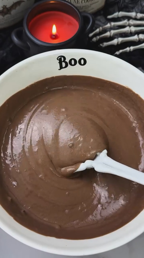 今回ご紹介するのは、ハロウィーンにぴったりのドクロケーキ作りの動画です。動画の冒頭で登場するのは、濃厚なチョコレート生地。ボウルの中で、しっとりとしたケーキ生地が艶やかに混ぜられます。