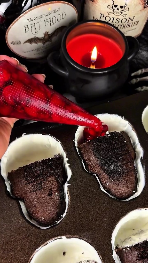 次にドクロの型に生地が流し込まれ、焼き上げられたケーキが現れると、早くもハロウィーンのムードが高まります。焼き上げたドクロ型のケーキの頭部をカットし、中にどろっとしたチェリーフィリングを詰めます。