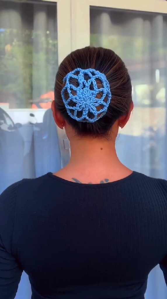 透け感のある編み模様から髪の色がほんのり見えるのがおしゃれなこのアイテム。髪をざっくりとお団子にした上からかぶせるだけで、一気に手が込んだヘアアレンジに見える点が魅力です。今回は水色で制作しましたが、毛糸の色を変えると印象が大きく変わりそうですね。