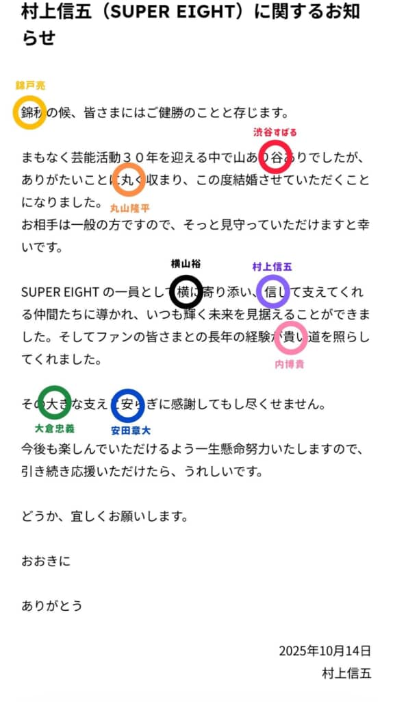 「SUPER EIGHT」の村上信五さんが10月14日、公式サイトで一般女性との結婚を発表しました。村上さんが発表した結構報告の文に、“歴代のメンバー”全員の名前の漢字が含まれていることが「粋すぎ」「泣ける」と話題を集めています。