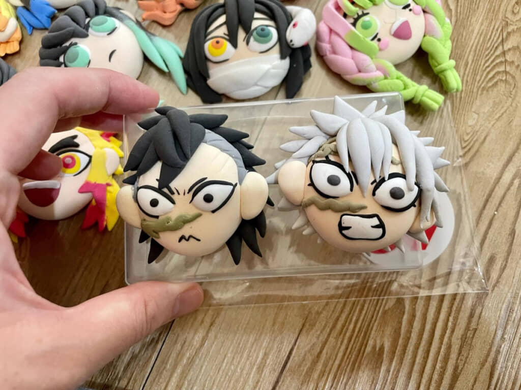 カラフルな色づかいで、キャラクターの顔をデフォルメして再現。フェイスマスコットのようなかわいらしい見た目です。例えば、不死川(しなずがわ)兄弟をよく見ると……顔のあざや髪の毛の生え際まで細かく表現されています。