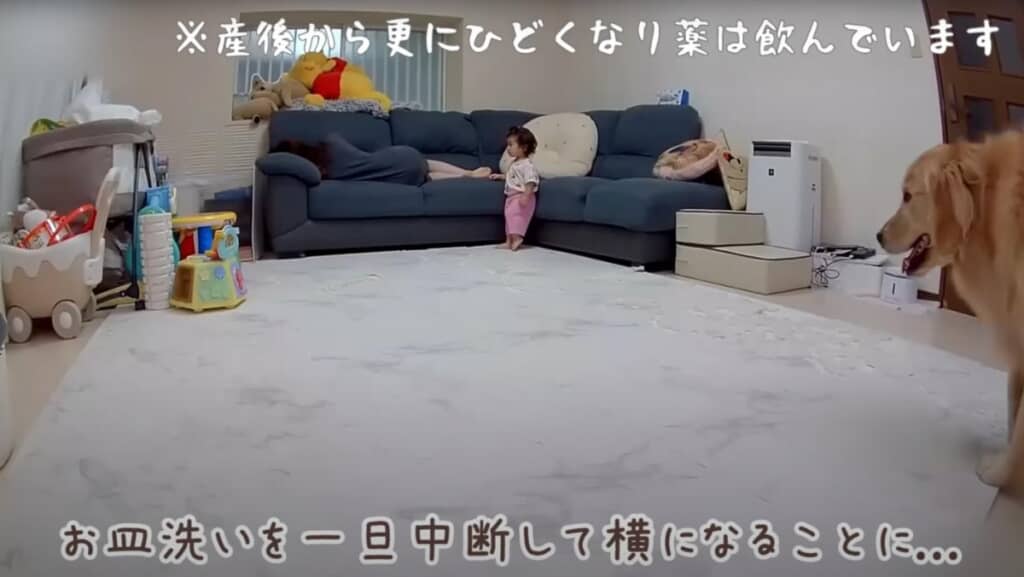 ママさんが洗い物をしている間に、パパさんとほのちゃんはお部屋のお掃除。うにくんとおからちゃんもお利口にしており、順調に進んでいるようです。しかし、偏頭痛がひどくなったママさんは洗い物を中断してソファで横になることに……。