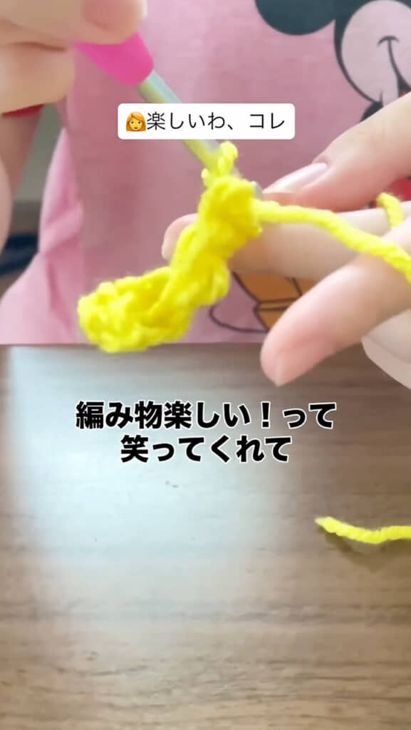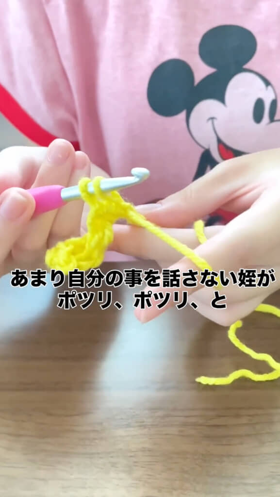 そこでかぎ針と黄色の毛糸を渡し、前からやってみたいと言っていた編み物を一緒にしてみることに。ちなみに、姪が編み物をするのは今回が初めて。みじゅりーさんは、1から丁寧に編み方を教えてあげました。