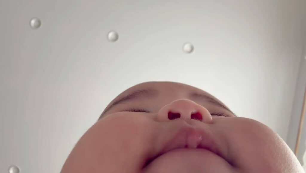寝ていると思っていた赤ちゃんは、いつの間にか目覚めた様子。まさかのアングルで捉えられたそのお顔は、まるで大福のよう……! ぷにっとしたほっぺたに思わず触りたくなります。
