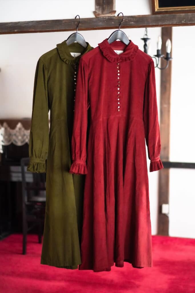 祖母が着ているのは木苺色、母はライトベージュのワンピース。襟と袖にはフリルをあしらい、袖はギャザースリーブで仕上げたデザインです。付属のヒモを後ろで結べば優しいチャームポイントに。ボタンには天然の貝を使用し、まるで宝石のような輝きを放ちます。程よい厚みがあり、夏以外の季節で着用できるそうです。