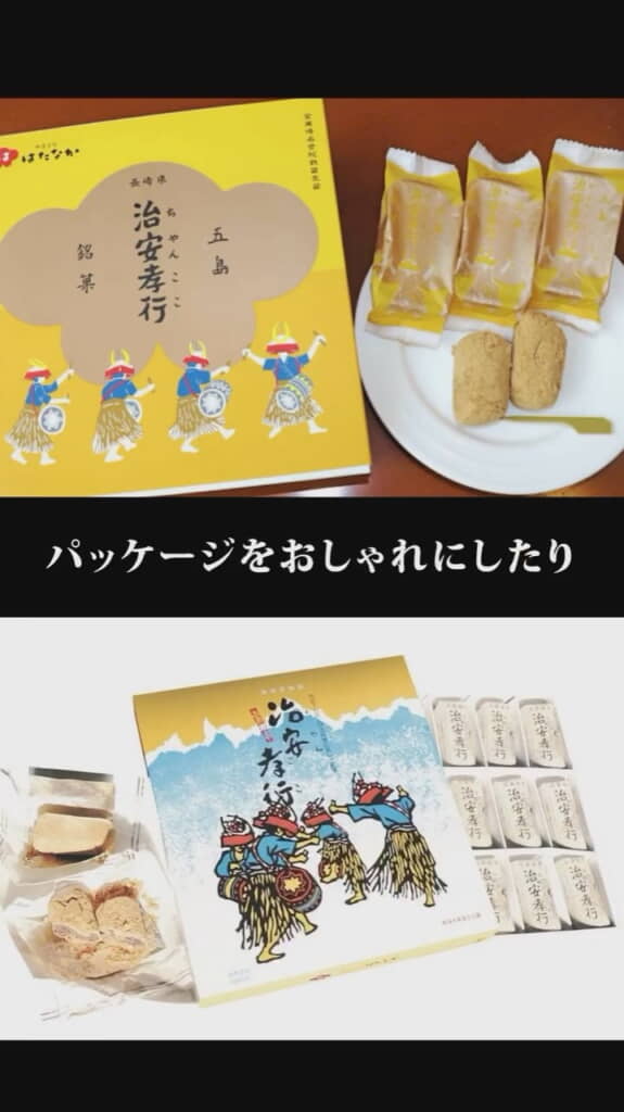 しかしまだまだ苦しい状況は変わりません。五島列島で100年以上続く「はたなか」の代表銘菓は「治安孝行(ちゃんここ)」。五島列島福江島に伝わる念仏踊り・チャンココ(長崎県無形民俗文化財)にちなんだお菓子です。お兄さんは、生前に会ったことのない祖父の思いを受け継ぎ、「治安孝行」を広めていきたいと語ってくれました。