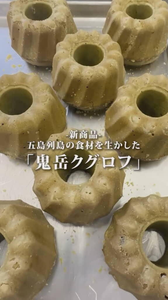 パッケージは伝統的なデザインを引き継ぎながら、おしゃれに一新。パティシエとして学んだ技術を活かし、新商品の開発にも力を入れました。そうして生まれたのが「鬼岳クグロフ」です。五島茶、五島の椿油、そして五島の卵。それらを使い、福江島のシンボル・鬼岳をモチーフにした一品。地元の素材にこだわった、思いのこもったお菓子です。