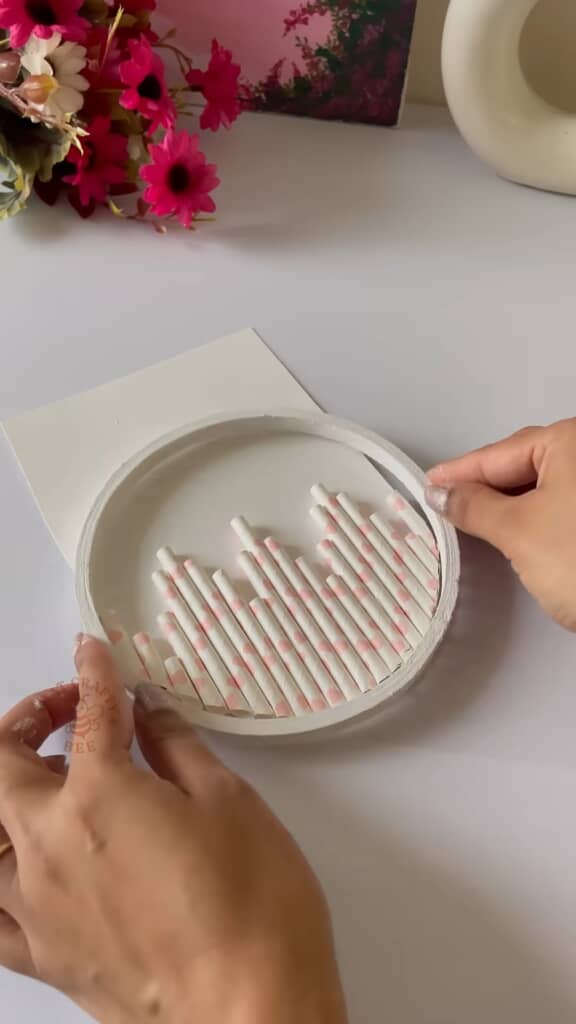 作業工程はとても簡単。真っ白な厚紙の上に接着剤を塗り、先ほどの紙ストローを一本ずつ互い違いになるように並べていきます。下半分を丸くカットしたら、白く塗装しておいた木製の刺しゅう枠をはめ込みます。