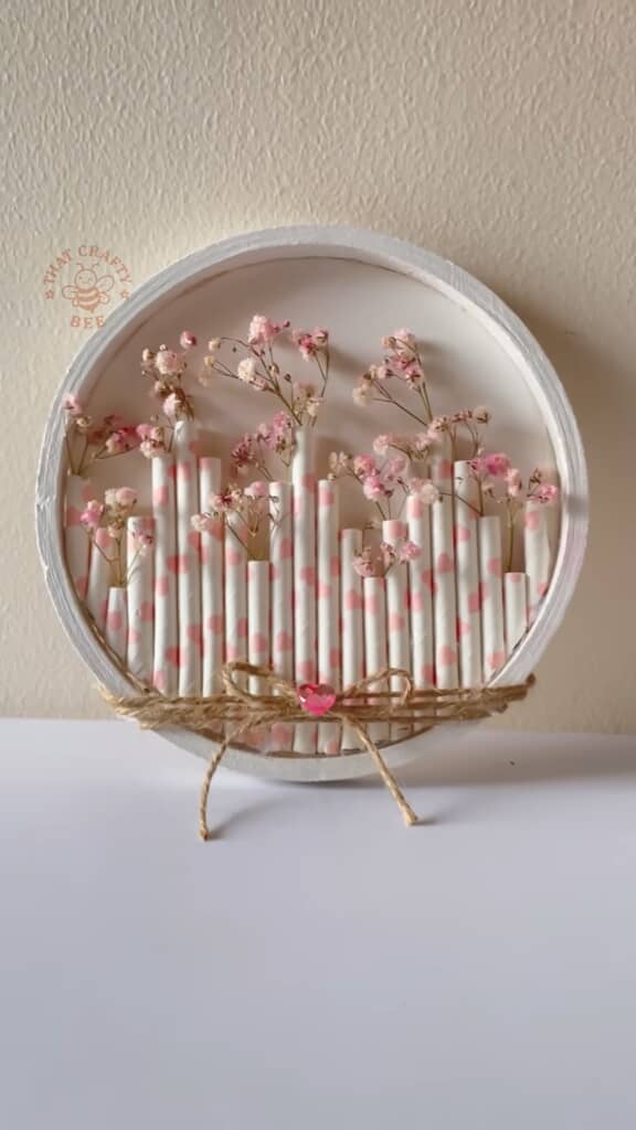 最後に、ピンクと白のかすみ草のドライフラワーを、ストローにそっと差し込んでいくと……ナチュラルな印象の手作り円形アートが完成です!