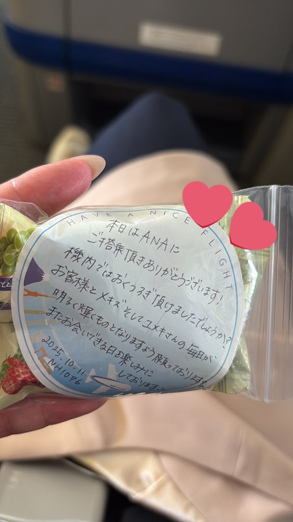 当時の状況を振り返り、shioriさんは「少しの間でしたがとても温かいやり取りをさせていただきました。キャンディとメッセージまで添えてくださって、本当に嬉しかったです。素敵なご対応をありがとうございました」と、CAから贈られたメッセージカードの写真を投稿しています。