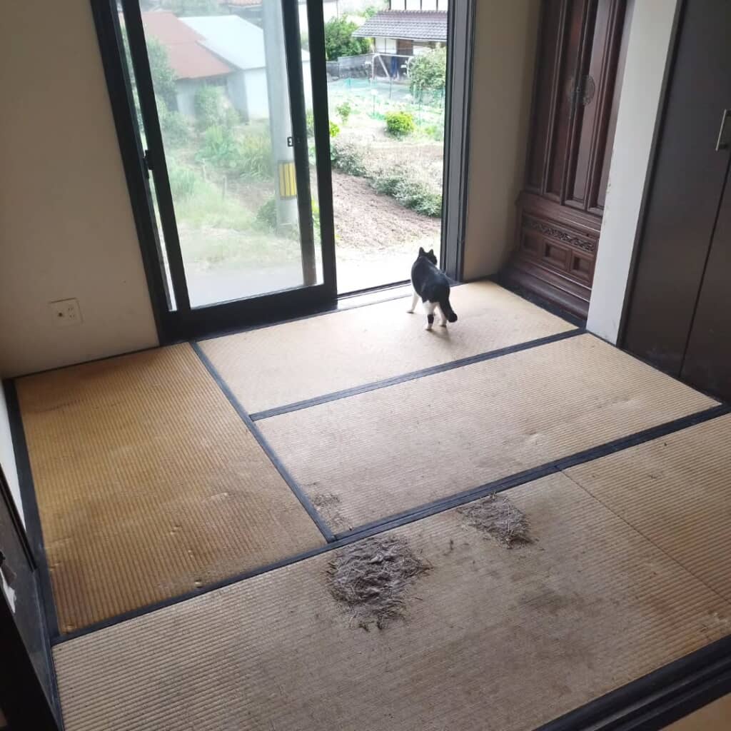 投稿者は、Threadsユーザーの安立未来(@mikiisk)さん。夫が病気で車いす生活になり、客間だった1階の和室を自室としていたそうで、「旦那が退院して帰ってきてからは、2階の寝室に上がれるはずもなく、旦那の部屋になってました。するとどうでしょう…」と車いすの向きを変える動きにより、畳がえぐれてボロボロになったといいます。
