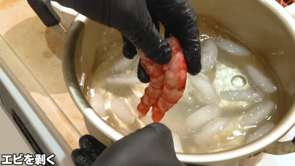 頭からミソを取り外したら殻をむき、しっぽを取りました。しっぽと同時に背ワタも取り除いたカラビネーロは、あらかじめ作っておいた氷塩水に入れておきます。その後も頭を落とす、ミソを取る、殻をむく、しっぽと背ワタを取る、という作業をひたすら繰り返して……。