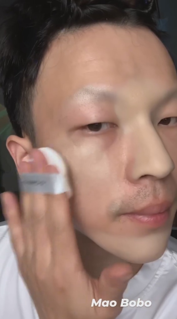 そこで投稿者さんは、まずシリコン製の鼻とあごをつけて、鼻の高さやあごの形をキャラクターに近づけます。次にスポンジを使い、肌全体にファンデーションを丁寧に叩き込みます。もともとの肌色を完全に消すほどの緻密なベースづくりです。陰影を感じさせない均一なトーンが、まるでCGのようなアニメ的質感を演出しています。