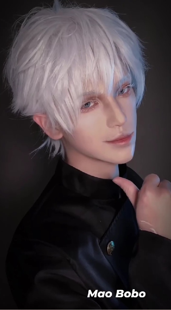 最後に白いウィッグを装着し、黒の制服を身にまとったら……五条悟のコスプレが完成! きれいな白髪(はくはつ)と青みを帯びた瞳が強い光を反射し、カメラを見つめるそのほほ笑みには、五条悟の余裕と自信が重なります。