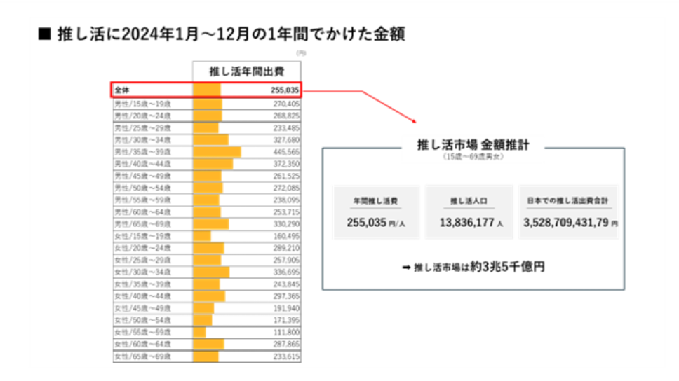 推し活の厳密な定義はないため、その市場規模は不明ですが、推し活総研の調査によれば、2024年の市場規模は約3.5兆円にものぼるとされます。またデータによれば、幅広い世代が推し活に取り組んでいる様子も見えてきます。