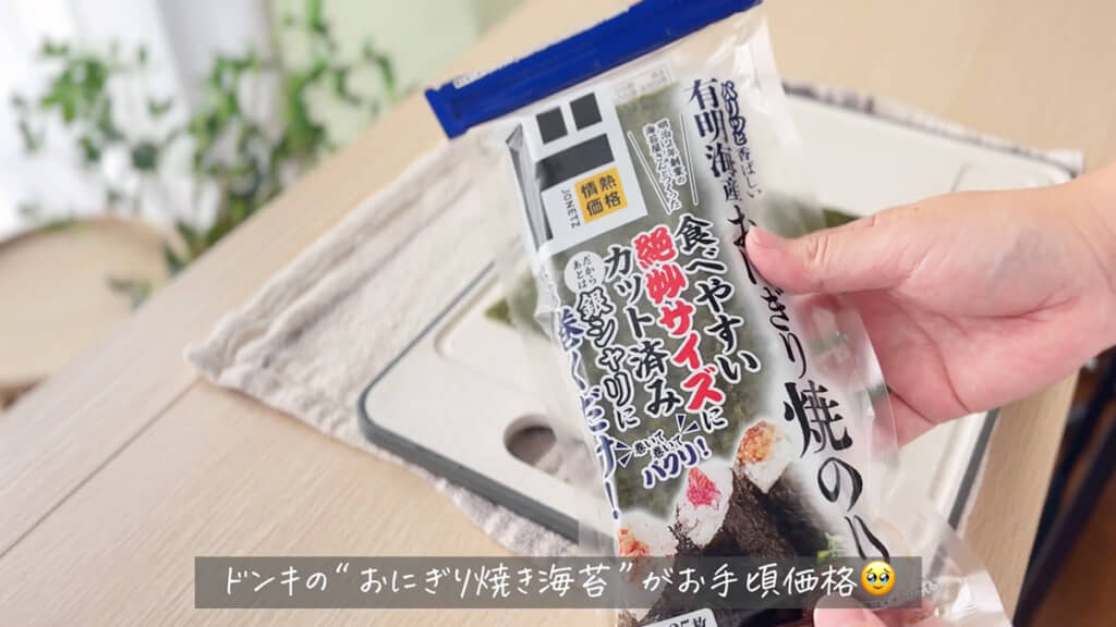 今回は、ドン・キホーテでお手頃価格の「おにぎり焼きのり(3切35枚)」を見つけたので、子どもでも食べやすいサイズの“小さめおにぎらず”を作っていきます。