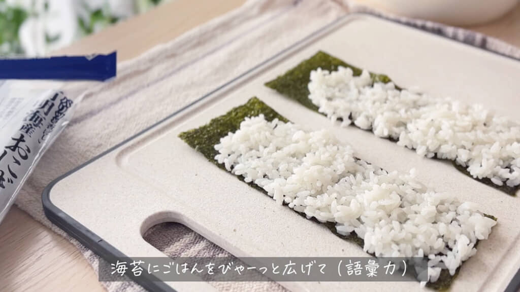 まずはのりをまな板に並べ、その上にごはんを50~60グラムほど乗せて、しゃもじで全体にまんべんなく広げていきます。このとき、のりの奥のほうを2~3センチ程度空けておくのがポイント。巻いたときに端がぴたっと収まりやすくなるそうです。