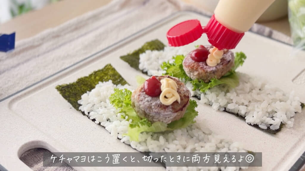 次に、のりの真ん中あたりにレタスとお弁当用のミニハンバーグを乗せ、ケチャップとマヨネーズを添えます。あとは手前からくるくると2回転がすだけ。ラップで包んで形を整えるので、巻きがちょっと甘くても、ごはんが少しのりからはみ出していても問題ありません。