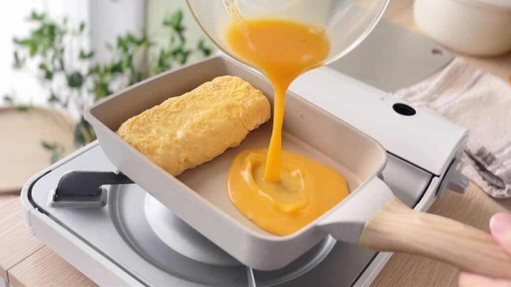 続いて、卵3個に白だし、砂糖、牛乳を加えた大きめだし巻き卵を作り、同じようにのりとごはんに乗せて巻いていきます。ごはんは温かいほうが伸ばしやすいので、冷やごはんを使う場合はレンジで温めてから作ると良さそうです。