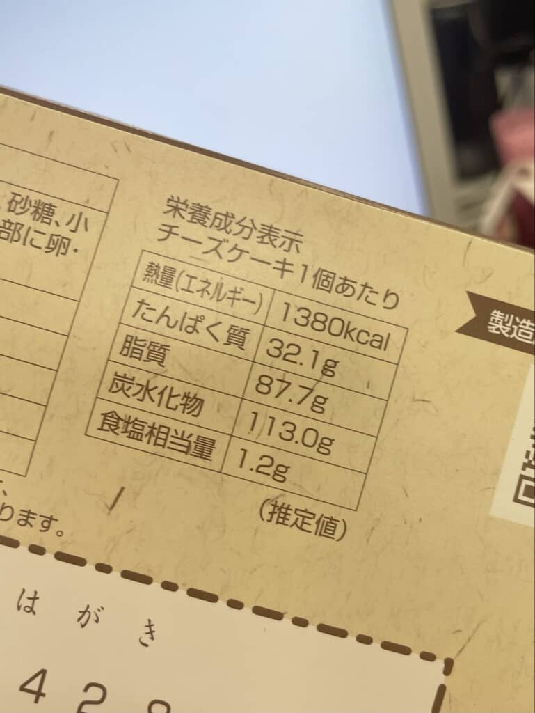 3/3)箱に記された成分表を見て驚がく。「1個1380キロカロリー」という現実に、SNSでも悲鳴と共感の声が続出(画像提供:たけだ/@takemo_saiyoさん)