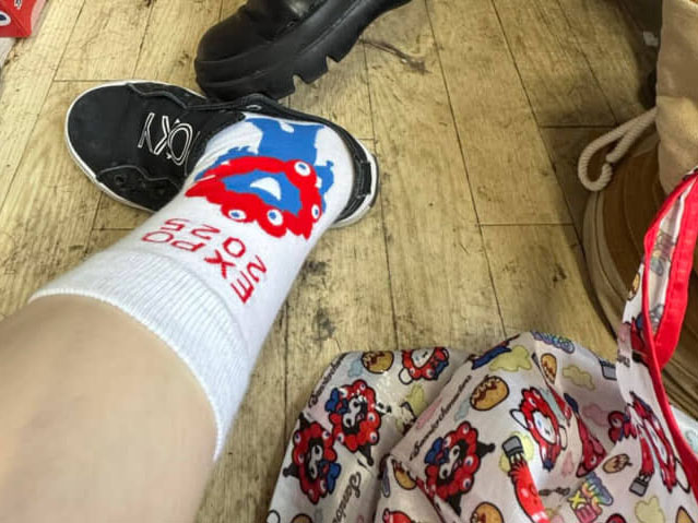 この日に履いていたのは、白地に大きな「ミャクミャク」と「EXPO2025」のロゴが入った靴下。ぱっと見で目をひく、なかなか派手なデザインです。