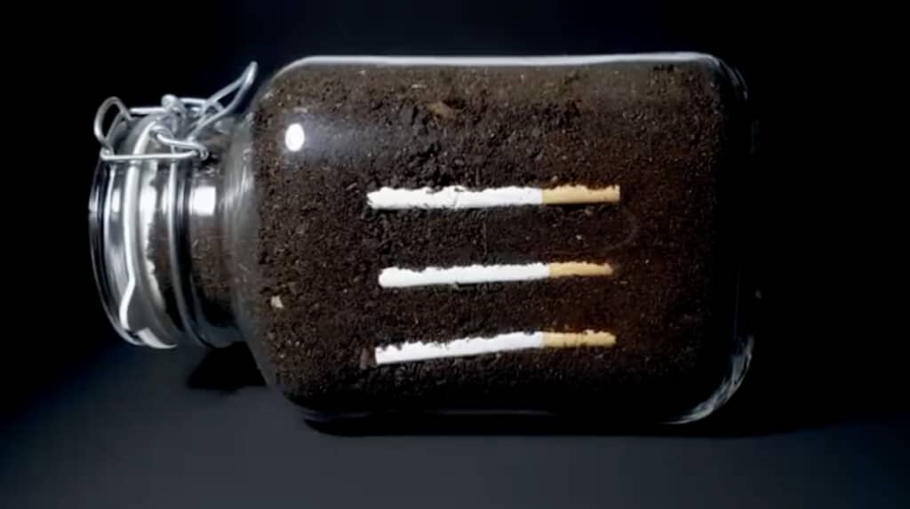 そして1年後、ビンを開けると中から取り出されたのは、タバコのフィルター部分のみ。ですが、予想外のことに、撮影では映っていなかった位置になんと植物の芽が。ただし実験後にこの植物を土に植え替えて9日間ほど観察したものの、植物は枯れてしまったようです。