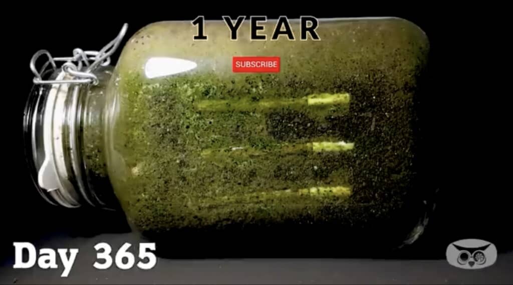 埋められたタバコには、12日を過ぎたあたりから白くカビのようなものが発生。約100日後から土の中に緑色のコケのようなものが生え始め、ビンの側面を覆っていきました。