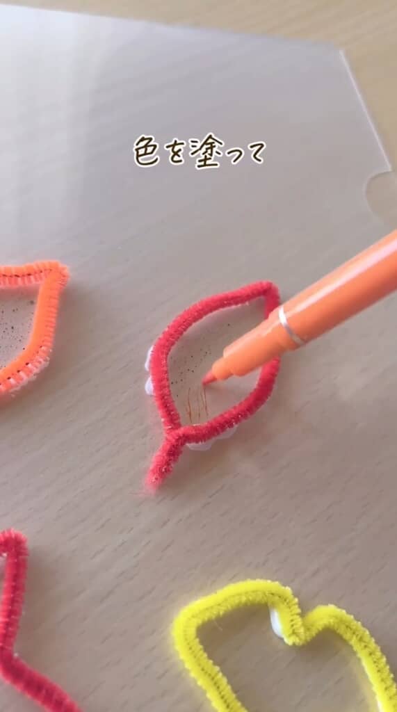 葉っぱモチーフを作ったら、続いてはボンドでクリアファイルに貼り付けます。モールの内側のクリアファイル部分を、好きな色の水性ペンで塗っていきましょう。