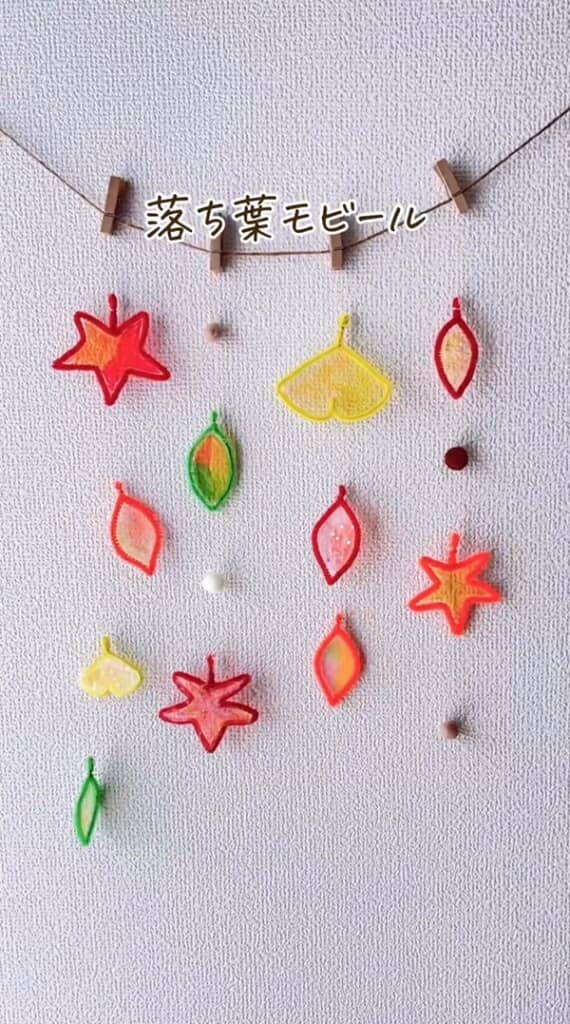 日に透かすとキラキラと宝石みたいに輝くところも落ち葉モチーフの魅力です。たくさん作ってモビールにすると、部屋の中で光がちらちらとして、とてもかわいいですよ。作り方も、落ち葉モチーフを吊るし紐に付けていくだけなので簡単です。