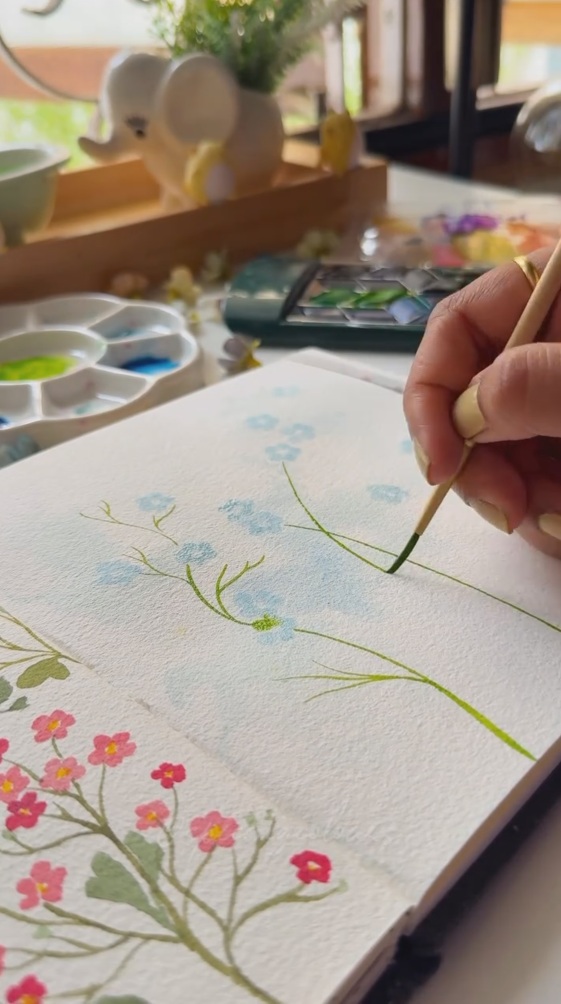 次に細筆で緑の茎や枝が描かれます。柔らかな青い花々の間を縫うように、細くしなやかな線が伸びていく過程は、見ていて気持ちがいいですね。色は明るい黄緑に近く、透明感を帯びた水彩ならではの軽やかさがあります。